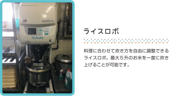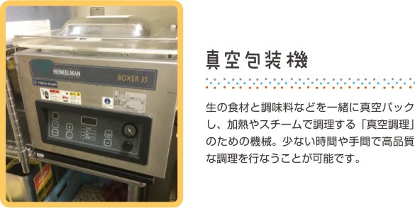 調理場には様々な「ひと手間」をサポートしてくれる調理機器が多数導入されています。料理に合わせた炊き方でご飯を炊く「ライスロボ」や、今話題の真空調理が可能な「真空包装機」などその役割は多種多様。迅速に、高品質な料理が作れる環境を実現しています。