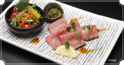 旅籠茶家かやかやで仕込んだローストビーフ。ビール、焼酎、ワインなど幅広いドリンクに合うと大好評です。