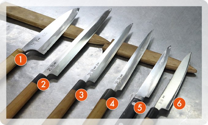 調理場には料理人それぞれ自前の包丁類があり、柏原さんは刺身用・野菜用の包丁の合計6本を持っています。